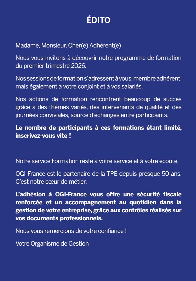 Découvrez le programme de formations dédié à la TPE présenté par OGI-France pour le premier trimestre 2025.
