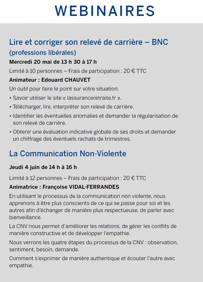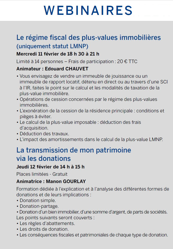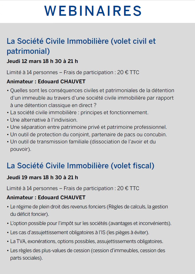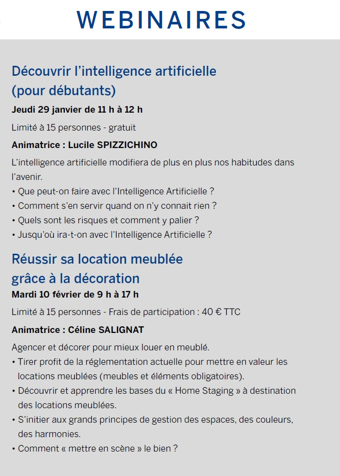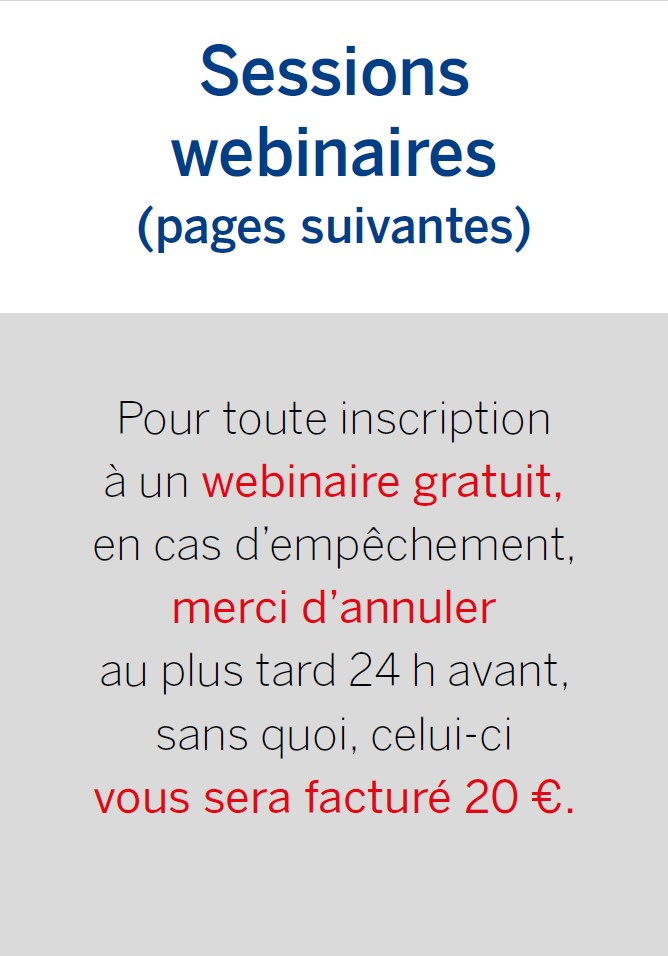 Les webinaires sont des modules d’information/formation à distance, de courte durée, visant à découvrir l’essentiel d’un sujet. Vous voyez le formateur ainsi que son support mais les autres participants ne vous voient pas et vous ne les voyez pas.