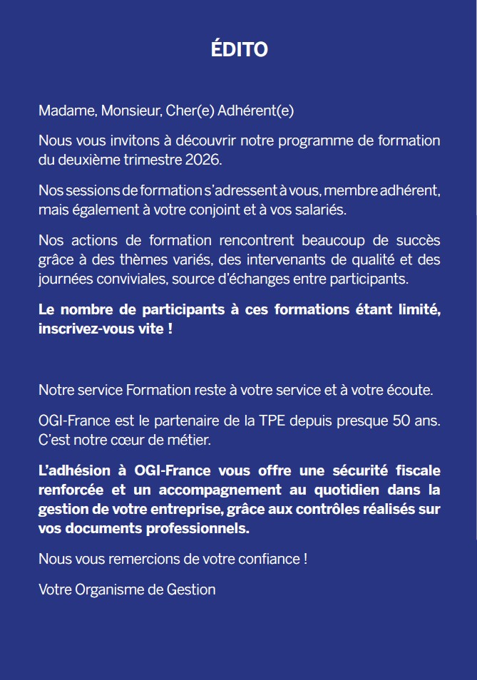 Découvrez le programme de formations dédié à la TPE présenté par OGI-France pour le premier trimestre 2026.